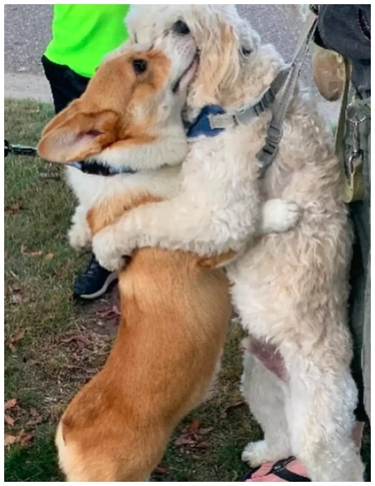 Wallace is sure to play gently with smaller dogs so as not to frighten his new pal. Wallace will not go in for the embrace until he checks with the other dog to see whether he is okay with it. “What’s noteworthy about his hugging is that he was not coached to do it,” Raminick explained. “I believe it boils down to him being overjoyed at the prospect of playing with another dog or person.”
